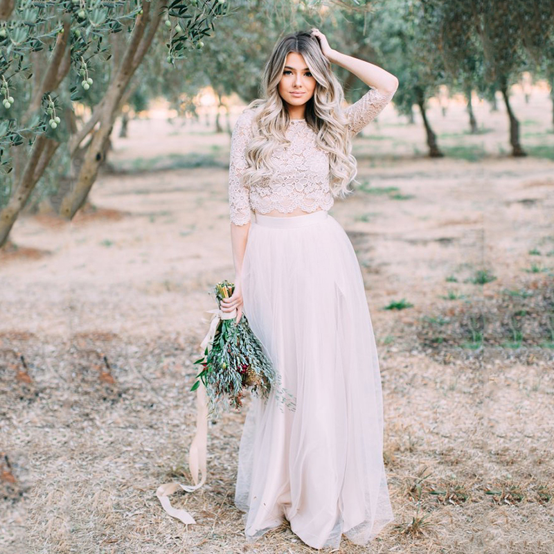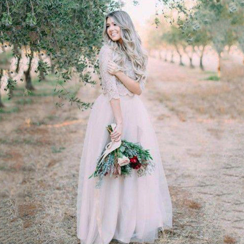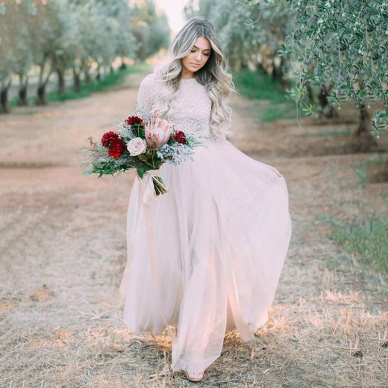 Bohemian O-Neck Wedding Dresses Side Split Long Sleeves Lace Appliques Vintage A-Line Bride Gowns Tulle Floor-Length