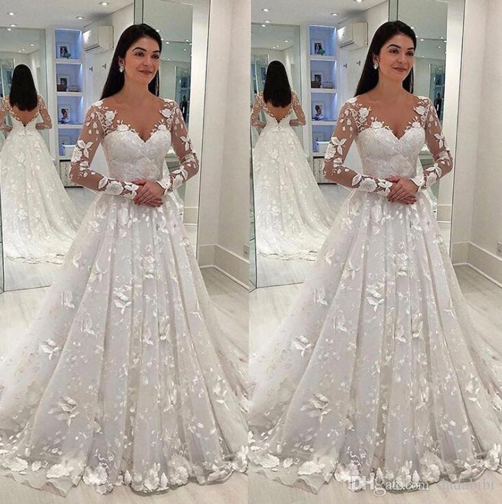 Wedding Dress White Lace Long Dress Deep V-neck Long Mesh Lace Sleeve A-line Pleated Floor-length Dresses