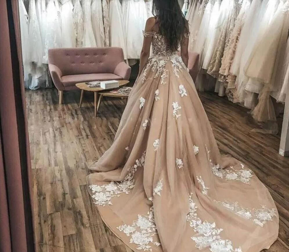 Champange Off Shoulder Wedding Dresses Lace Appliqued Sweep Train Plus Size Wedding Dress Bridal Gown