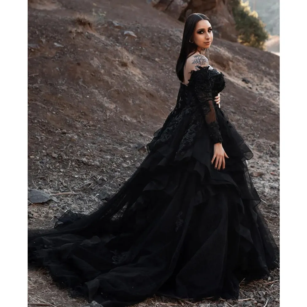 Plus Size Black Wedding Dresses Lace Beaded Sheer V Neck Illusion Long Sleeve Civil Bridal Gown Robe mariee Custom Made Robe De Mariee