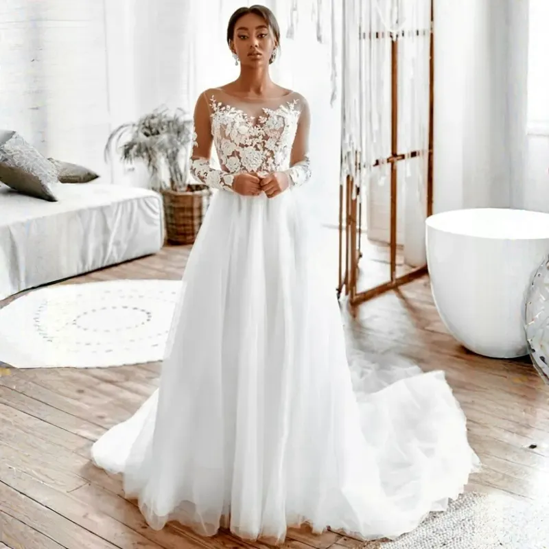 Sheer Neck Country Wedding Dresses Illusion Tulle Lace Covered Button Beaded Bridal Gowns Dress for Bride