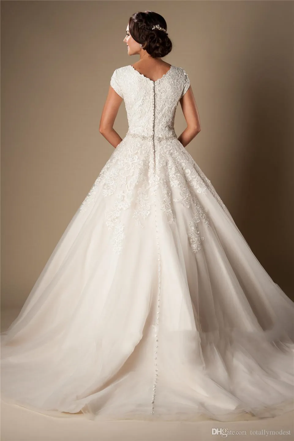 Ivory Lace Tulle Ball Gown Modest Wedding Dresses Cap Sleeves Short Sleeves Princess Bridal Gowns Beaded Belt Bridal Gowns Button Back