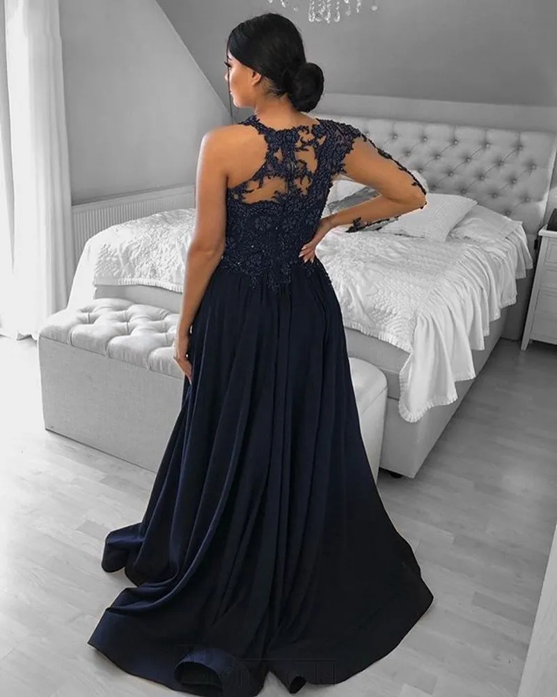 One Shoulder Navy Blue Dubai Evening Dresses Long Sleeve A-Line Split Satin Lace Beaded Formal Prom Dress Robe De Soiree