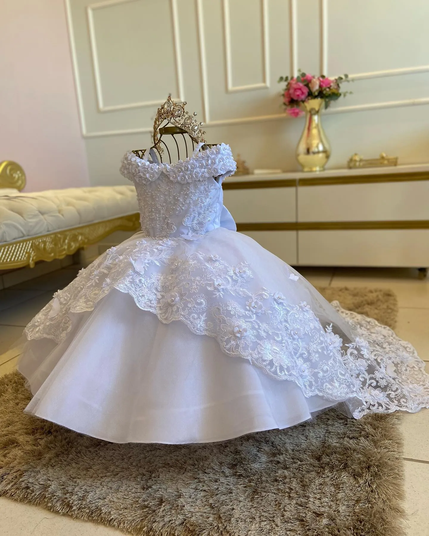 White Pearls Flower Girls Dress First Birthday Princess Beaded Floral Tulle Christmas New Ball Gown Photoshoot