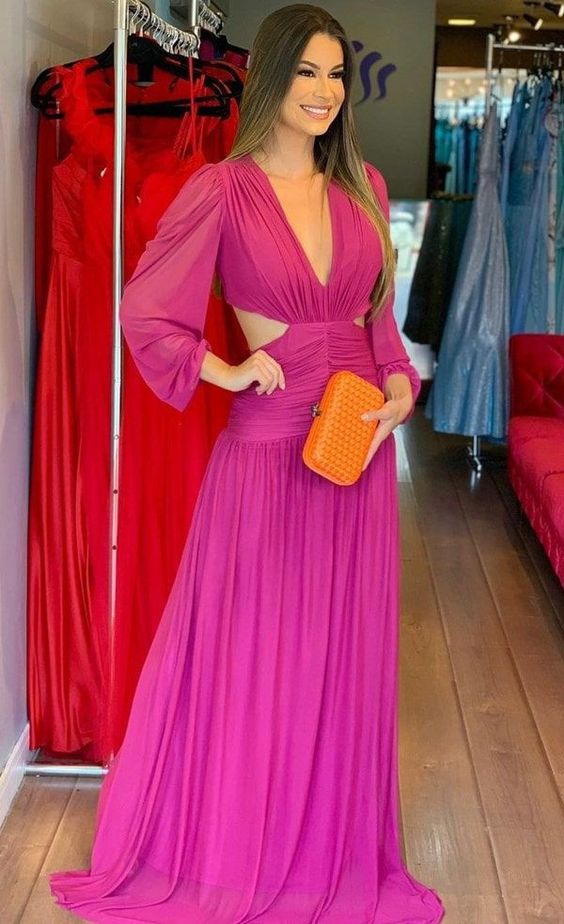 Hot Pink Fuchsia Sheer Long Sleeve Prom Dress Graduation Gown Party Dress