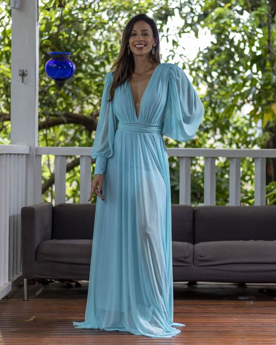 Blue Long Sleeve Chiffon Prom Dress Graduation Gown Party Dress