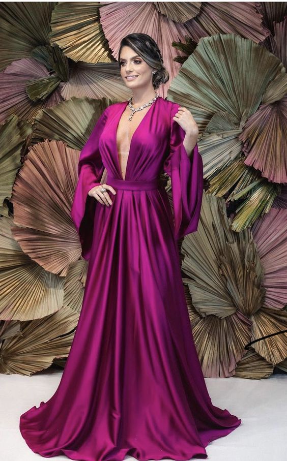 Simple Burgundy Hot Pink Fuchsia V Neck Prom Dress Graduation Gown Party Dress