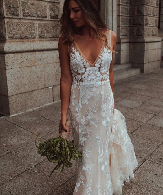 Elegant Mermaid Lace Appliques Beach Boho Wedding Dress Bridal Gowns
