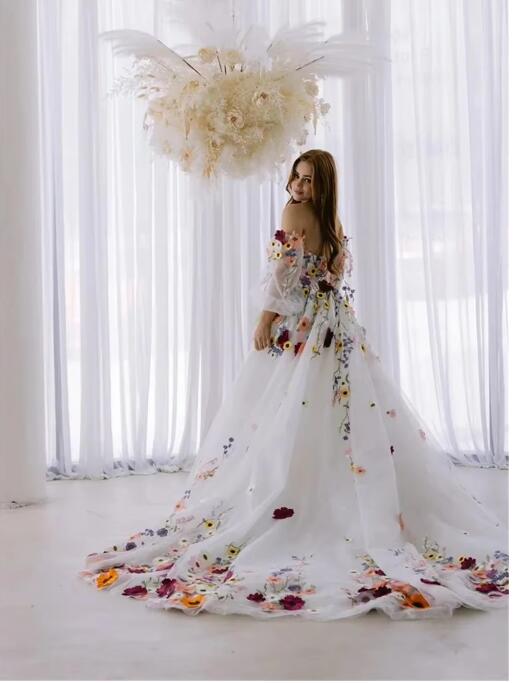 Customized New 3D Flower Puff Sleeves Bridal Dress Embroidery Floral Tulle Prom Dresses Wedding Party Dresses Vestidos De Noche
