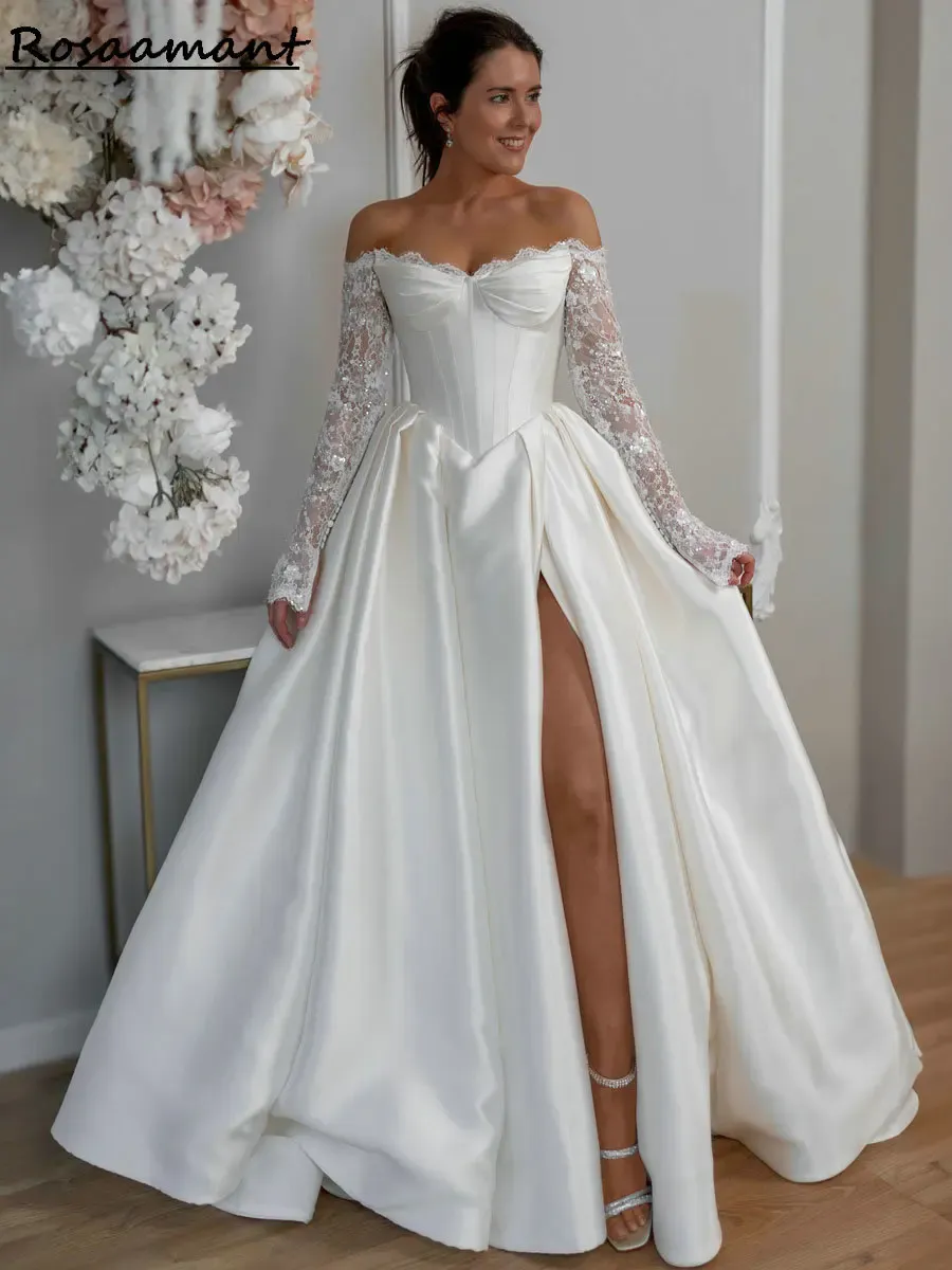 Vintage Lace Long Sleeve High Split A-Line Wedding Dresses Off The Shoulder Beading Pearls Boho Country Bridal Gowns