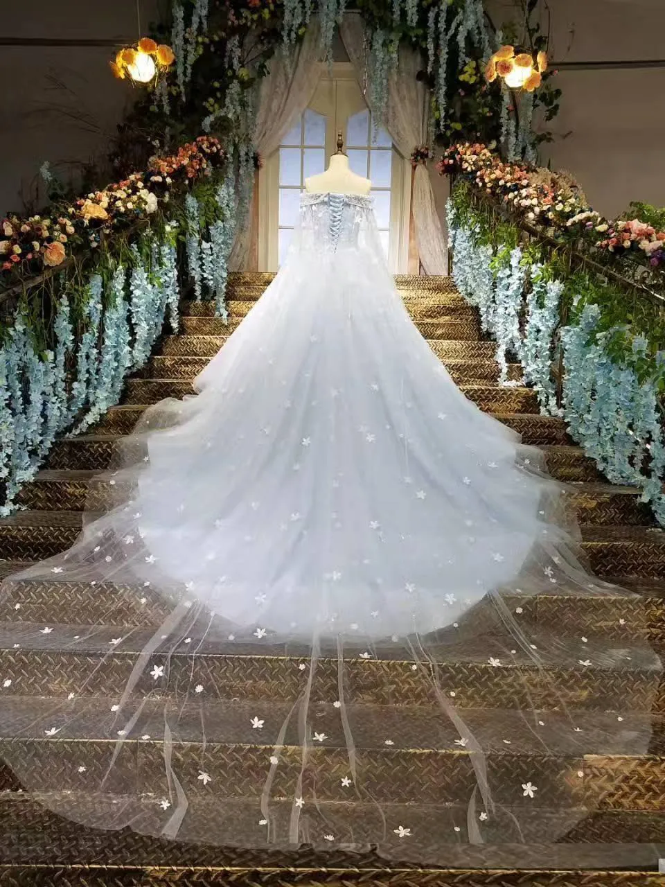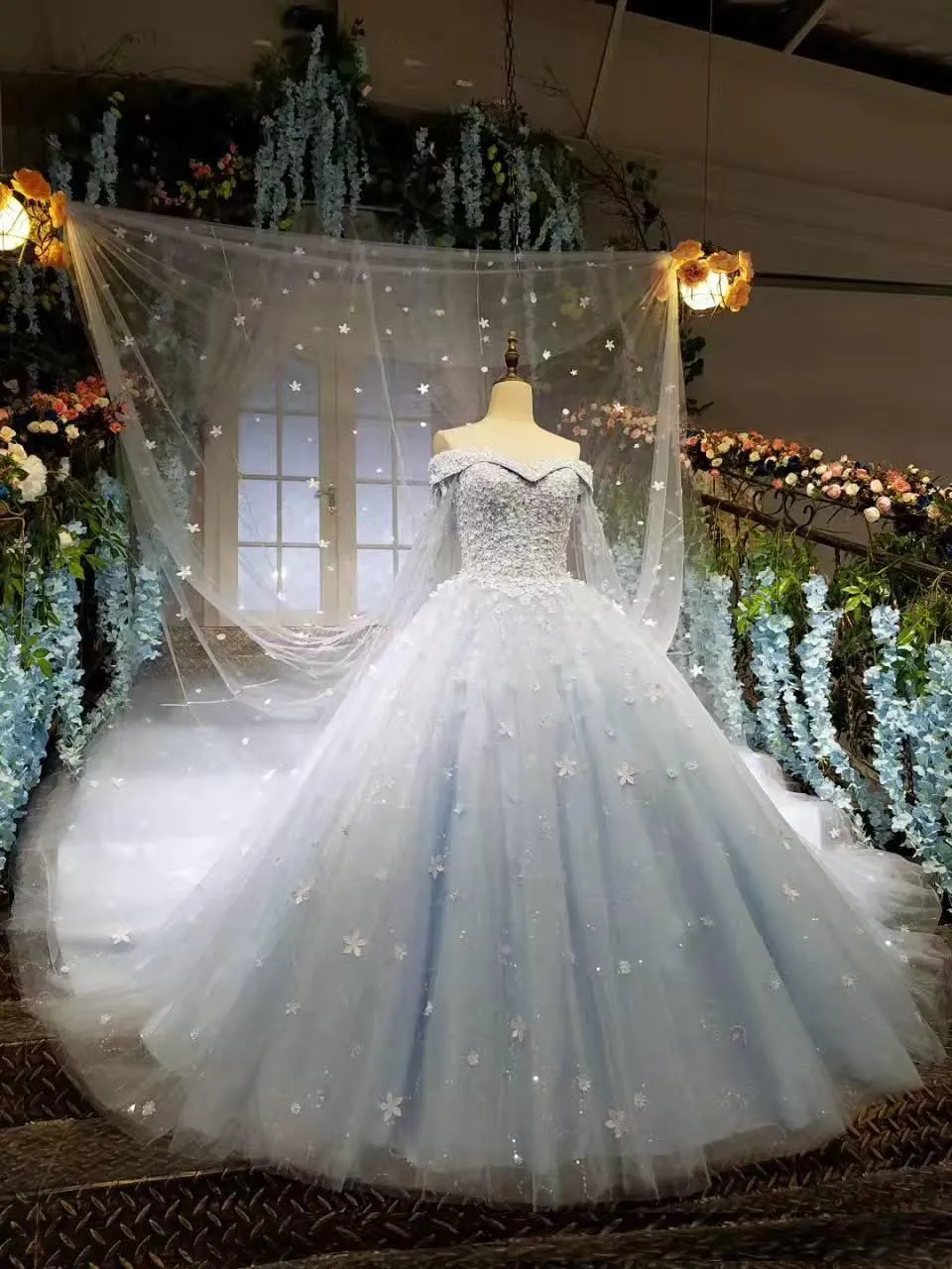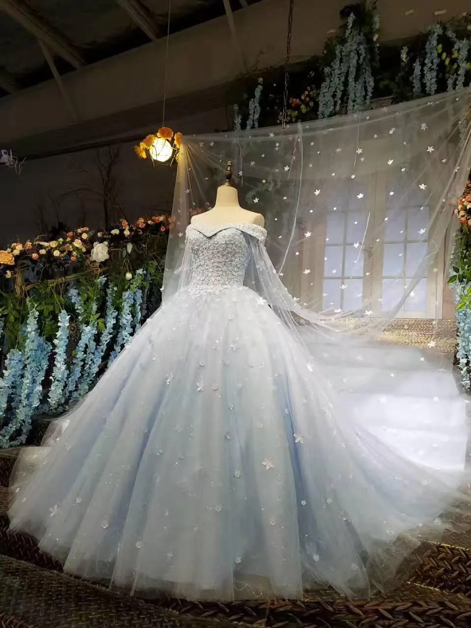 Custom made Cinderella Ball Gown Wedding Dresses Light Sky Blue 3D applique Princess Bridal Gowns With Long Wraps sweet wedding wear