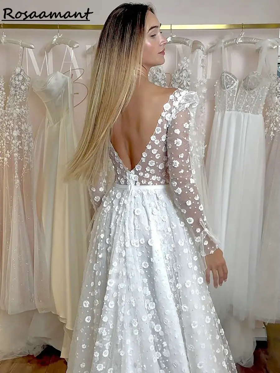 Luxury Illusion 3D Flowers Backless A-Line Wedding Dresses Deep V-Neck Long Sleeve Boho Country Customized Bridal Gowns