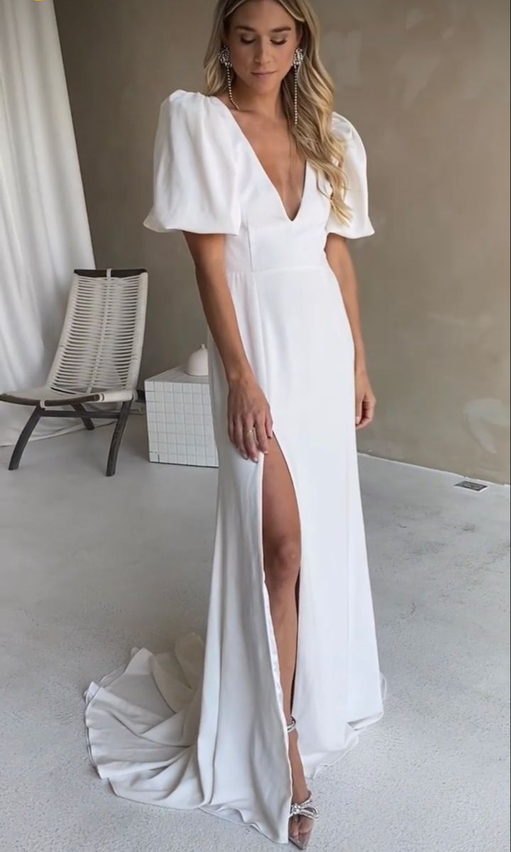 Simple Sheath Short Sleeve Side Slit Beach Bohemia Wedding Dress Bridal Gowns Wedding Gown