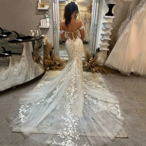 Luxury Lace Mermaid Wedding Dresses Off Shoulder Long Tail Sexy Bridal Gowns Tulle Beach Wedding Gown