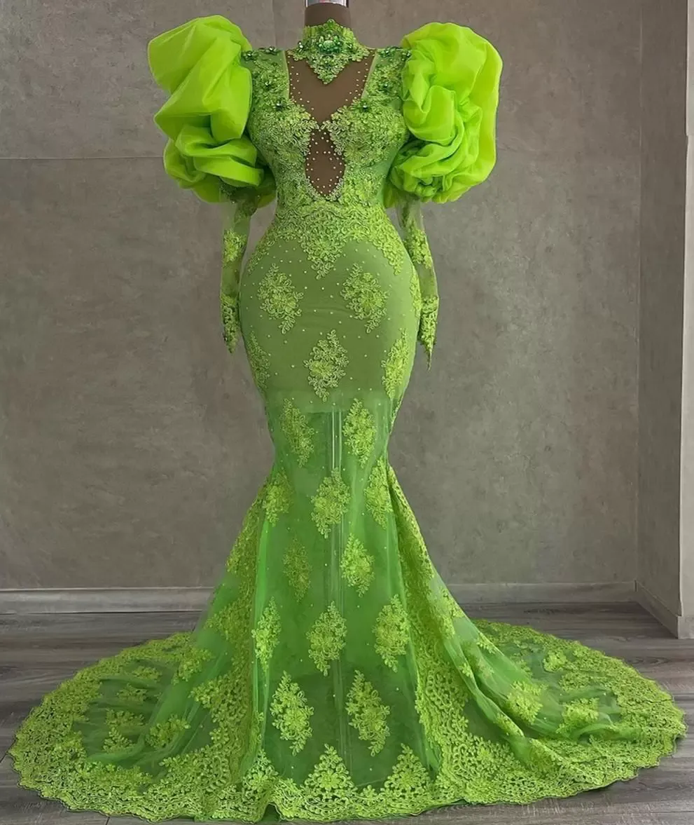 Green Prom Dresses Mermaid Long Sleeves Lace Applique Beaded Custom Made High Neck Ruffles Evening Formal Gowns Formal Occasion Wear vestidos