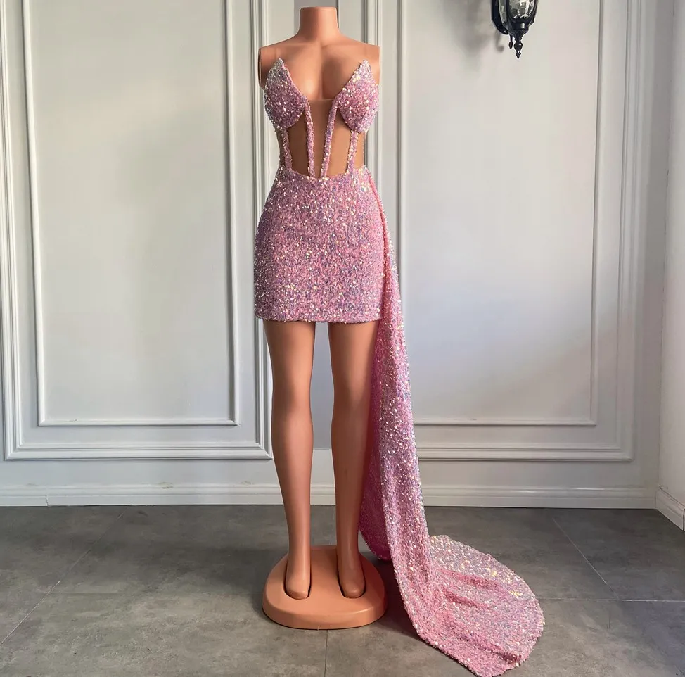Pink Short Prom Dress 2023 Sheath Sparkly V-neck Velvet Sequined Women Birthday Gala Party Gowns Robe De Soiree Customed