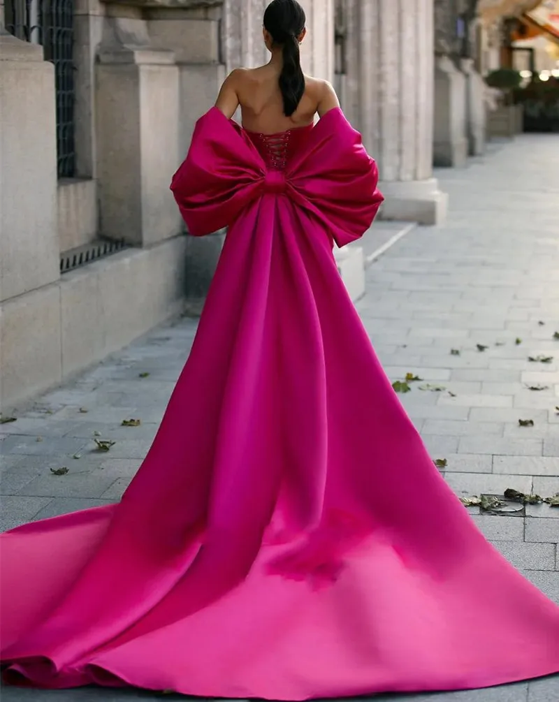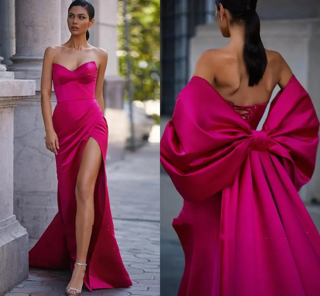Romantic Mermaid Evening Dresses Pink Satin With Detachable Bow Train Sleeveless Splilt Prom Gowns Sweetheart For Birthday Party Vestidos Fieast