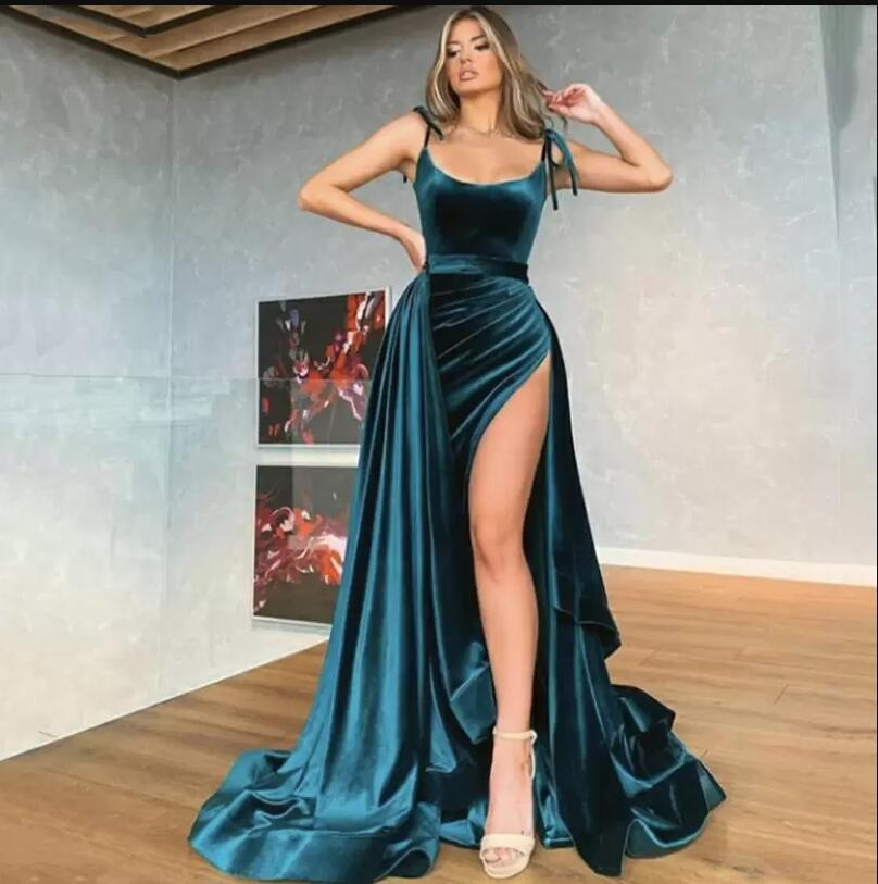 Velvet Mermaid Prom Dresses Spaghetti Straps High Side Split Sweep Train Formal Evening Party Gowns