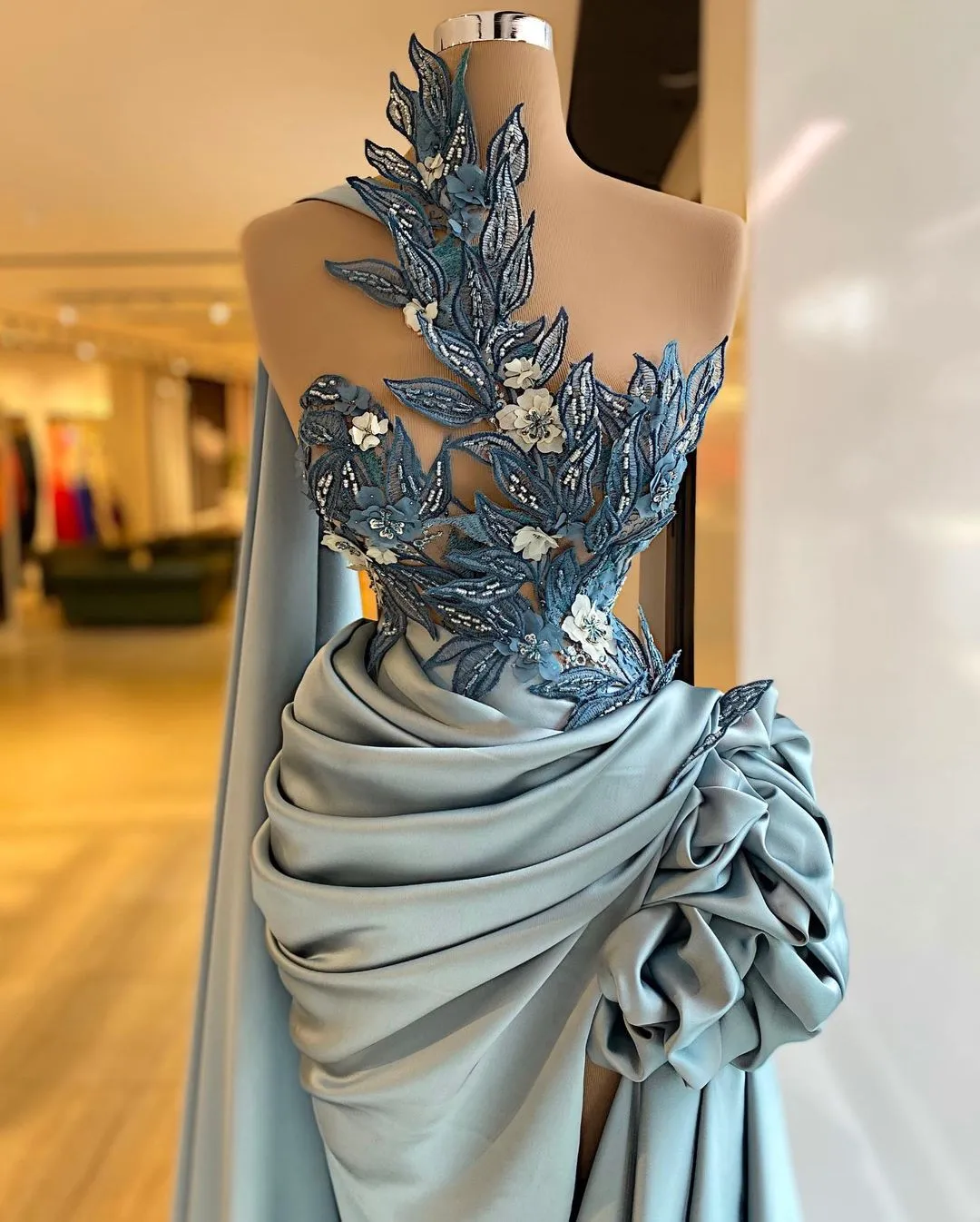 Arabic Silver Lace Beaded Evening Dresses High Neck Prom Dresses High Split Formal Party Second Reception Gowns