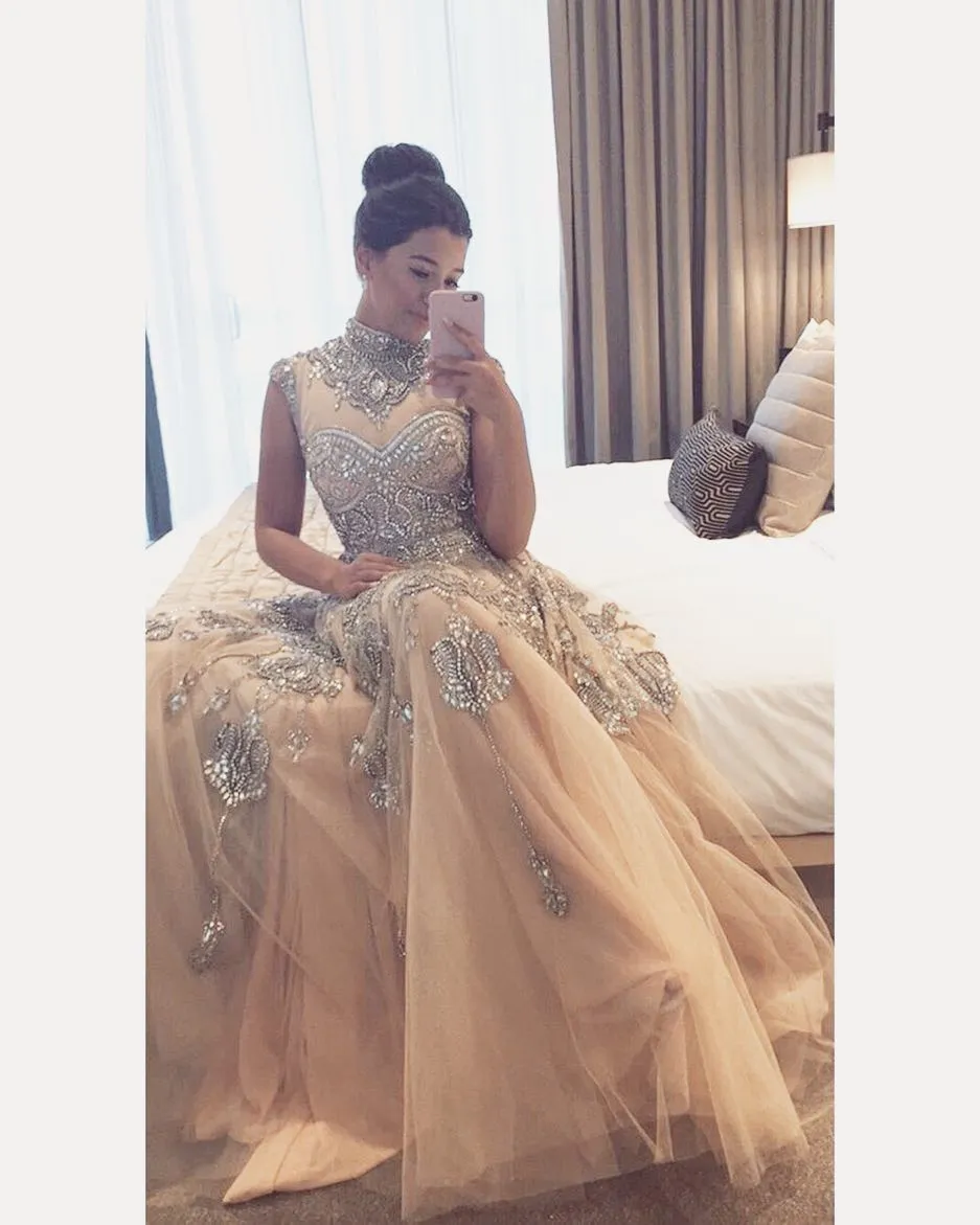 Muslim Champagne Beaded Crystals Evening Dresses High Neck Prom Dresses Sexy Formal Party Second Reception Gowns