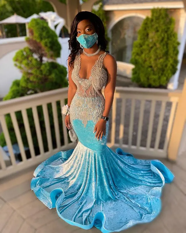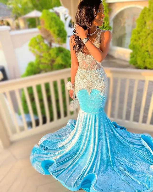 Arabic Aso Ebi Blue Luxurious Mermaid Prom Dresses Beaded Crystals Velvet Evening Formal Party Second Reception Gowns Dress
