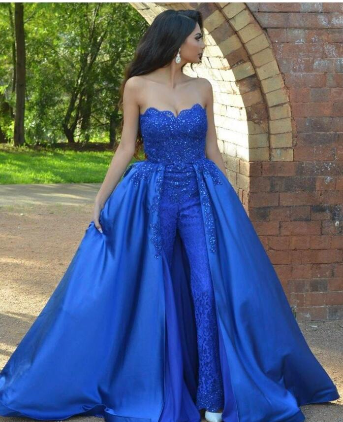 Royal Blue Jumpsuits Lace Prom Dresses Strapless Neck Beaded Overskirt Evening Gowns Vestidos De Fiesta Sweep Train Appliqued Formal Dress