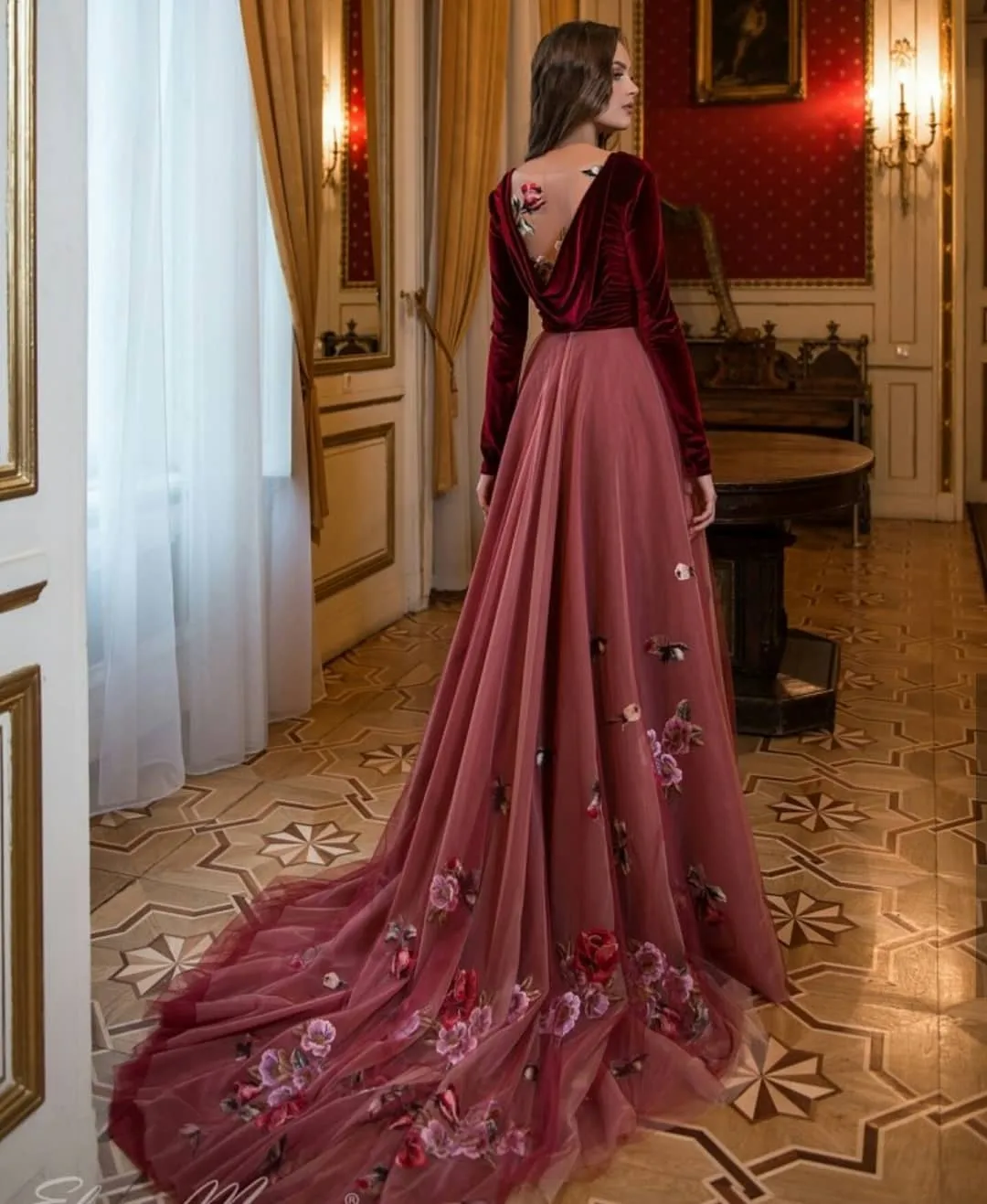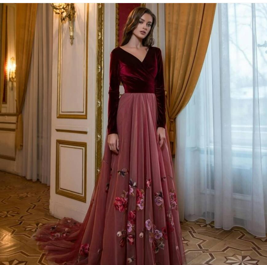 Stunning Velvet Backless Prom Dresses V Neck Floral Appliqued Long Sleeves Evening Gowns Vestidos De Fiesta Sweep Train Tulle Formal Dress
