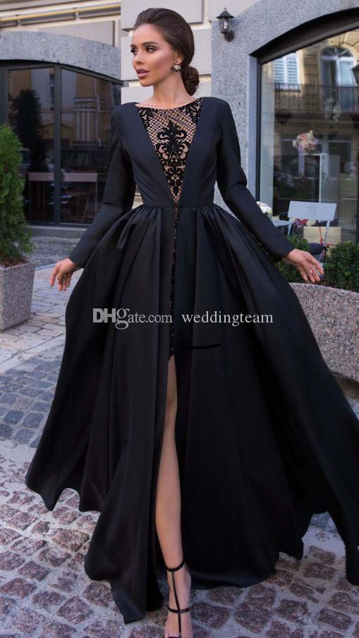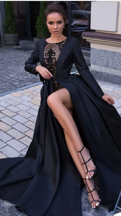 Black Lace Prom Dresses With Jacket Bateau Neck Long Sleeves Evening Gowns Floor Length Plus Size Satin Formal Dressmal Dress