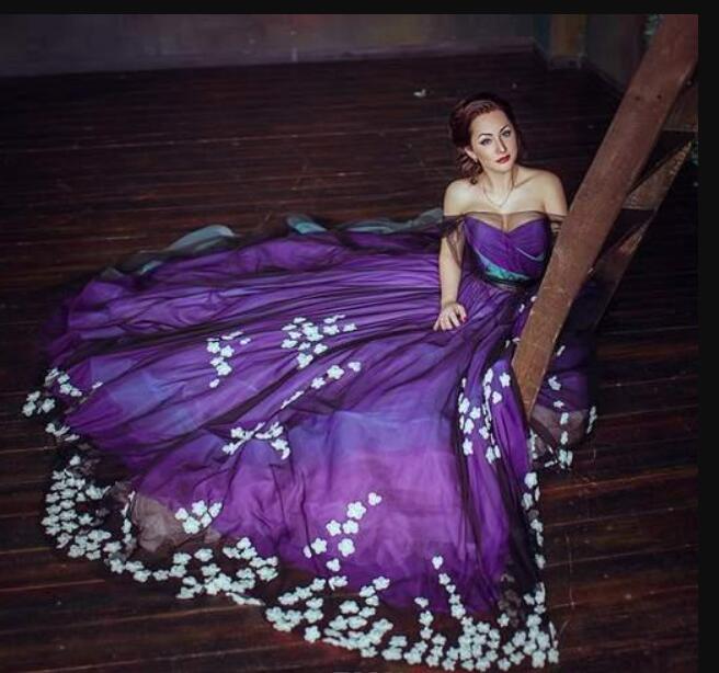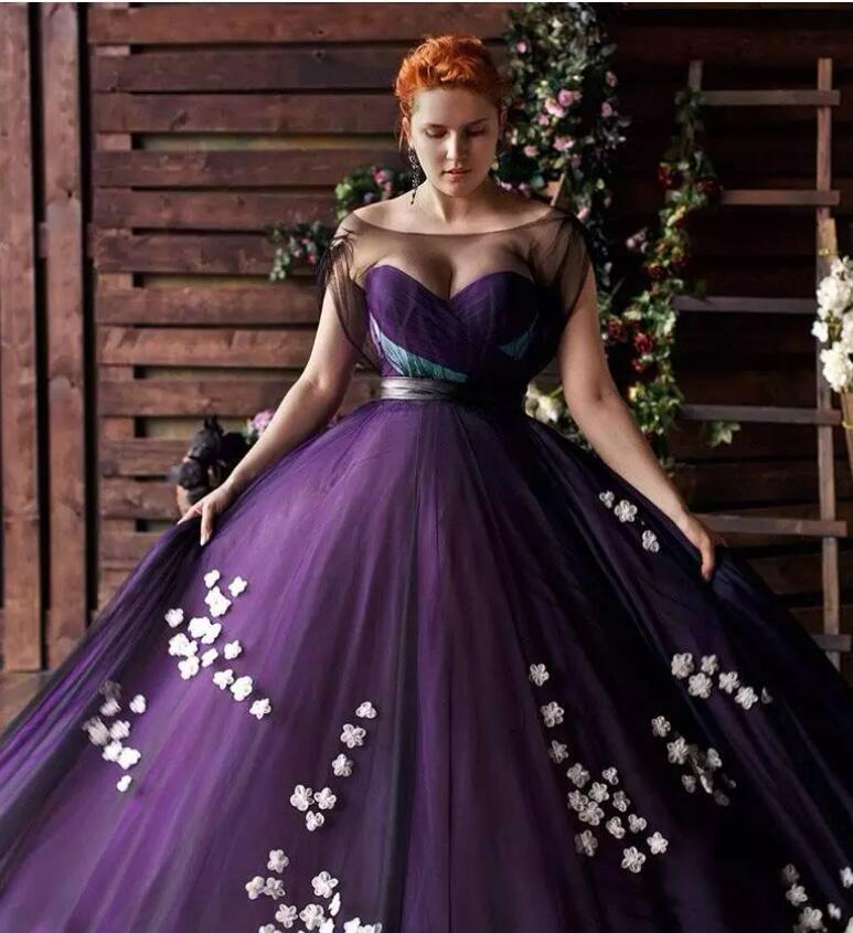 Stylish Purple Plus Size Prom Dresses Floral Applique Sheer Bateau Neck Evening Gowns A-Line Sweep Train Tulle Formal Dress