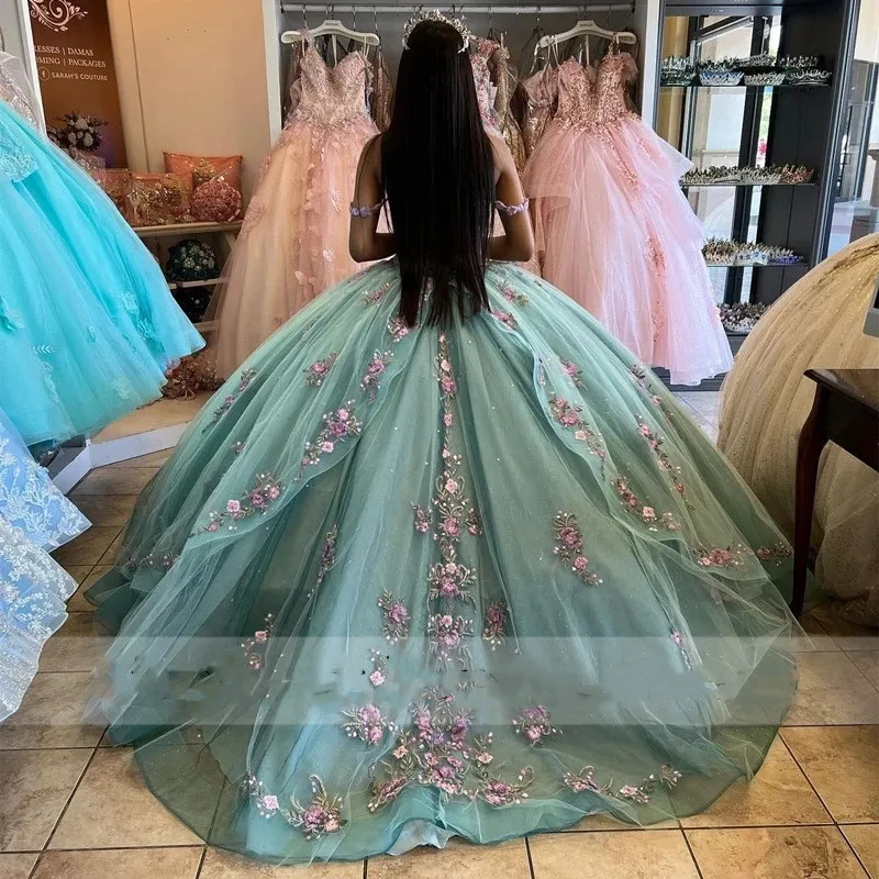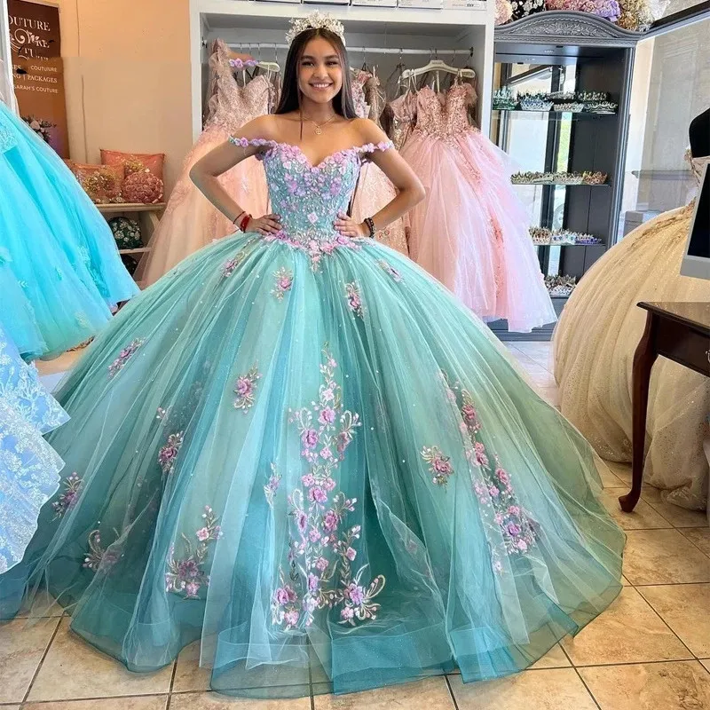 Princess 3D Flowers Quinceanera Dresses 2023 Off Shoulder Appliques Beads Lace-up Mexi Sweet 16 Dress Vestidos De 15 Anos Prom Dress