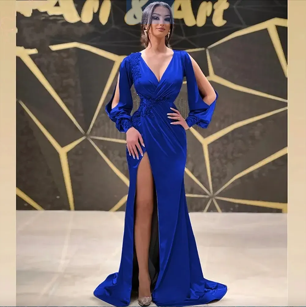 Royal Blue Mermaid Women Evening Dress Long Sleeves V Neck Side Slit Satin Lace Applique Formal Prom Party Gowns Robe De Soiree