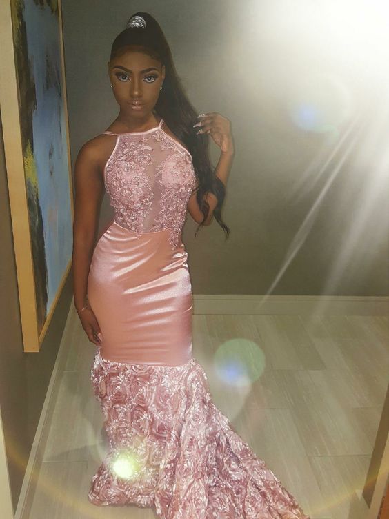 Pink Mermaid Lace Appliques African Prom Dress Evening Gowns