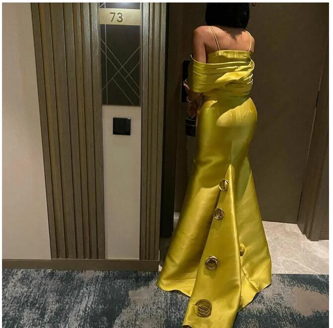 Elegant Long Yellow Satin Off Shoulder Pleated Evening Dresses With Hand Made Flower Mermaid Sweep Train Zipper Back Prom Dress Robe De Soiree