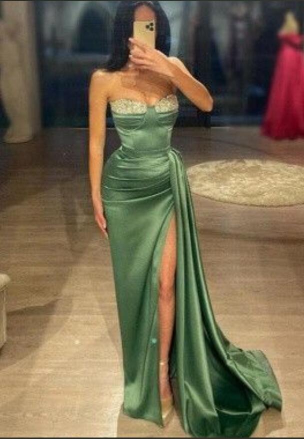 Green Sheath Beading Crystals Side Slit Prom Dress Formal Dress Evening Gowns