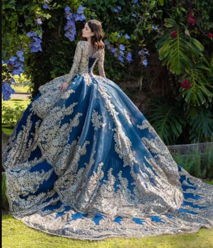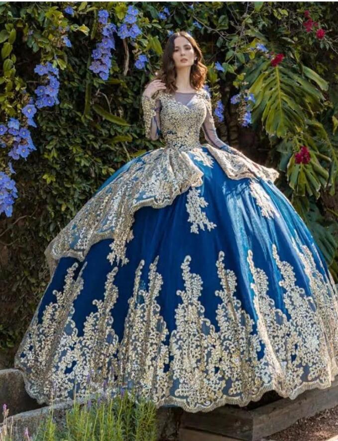 Blue Quinceanera Dresses Long Sleeve Gold Lace Appliqued Sequined Bead Mexican Sweet 15 Gowns Puffy Skirt Vestidos 16 Anos