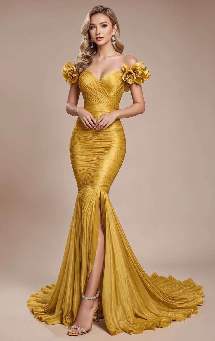 Yellow Mermaid Off the Shoulder Handmade Flowers Prom Dress Evening Formal Gown Birthday Party Gown