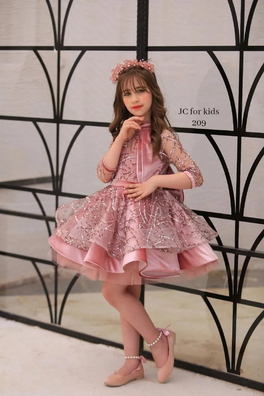 Tier Ruffle Cupcake Tutu Girls Pageant Dresses Princess Pink Red Sequined Beadings Short Flower Girl Dresses With Sheer 3/4 Sleeves Bow