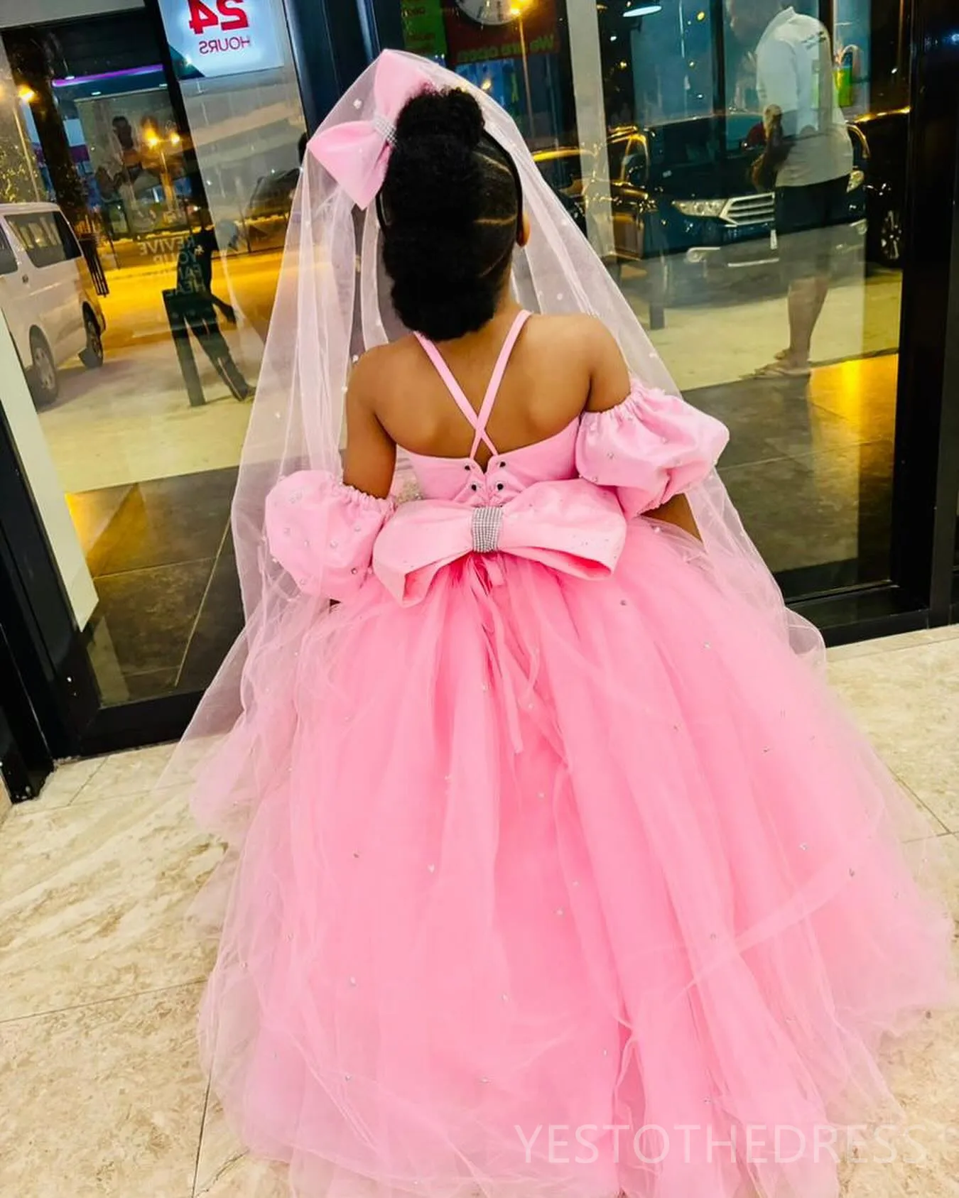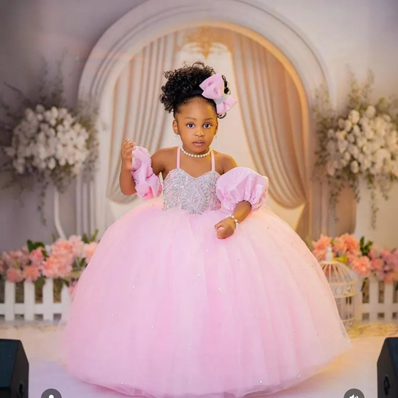 Pink Flower Girl Dresses Birthday Party Dress Illusion Spaghetti Straps Rhinestones Beaded Decorated Tiered Tulle Princess Ball Gown