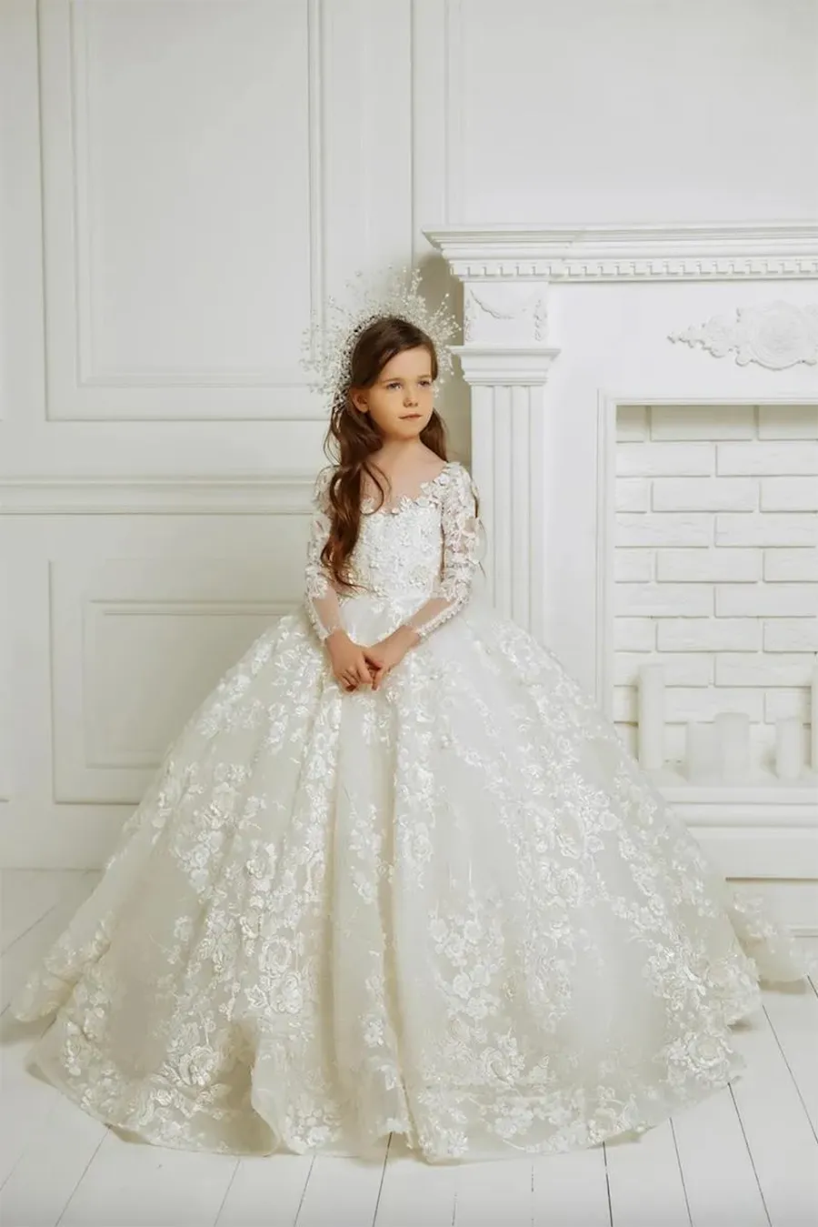 Ivory Girls Dresses Long Sleeve Lace Flower for Weddings Princess First Communion Evening Party Birthday Pageant Prom Ball Gowns