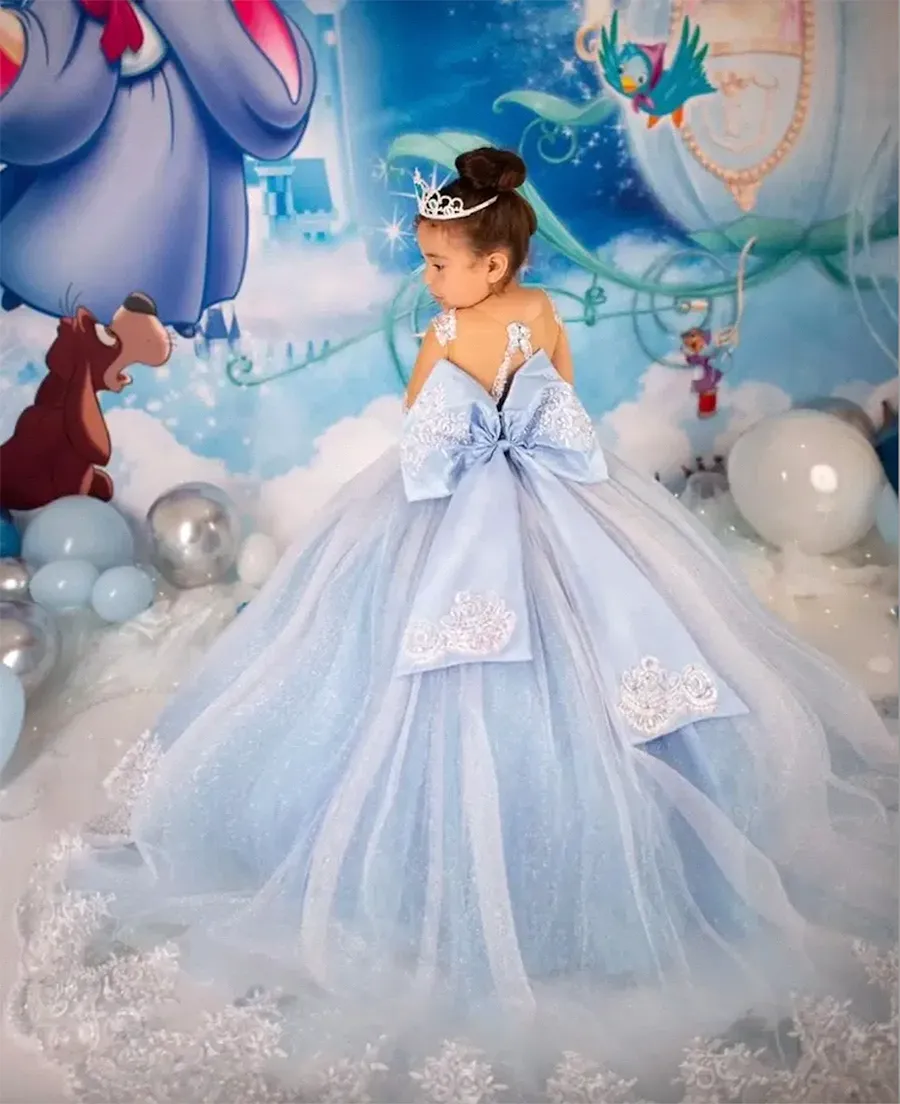 Princess Blue Flower Girl Dresses With Big Bow Sash A Line Crew Neck Sheer Long Sleeves Appliques Sequins Long Toddler Teens Pageant Party Gowns