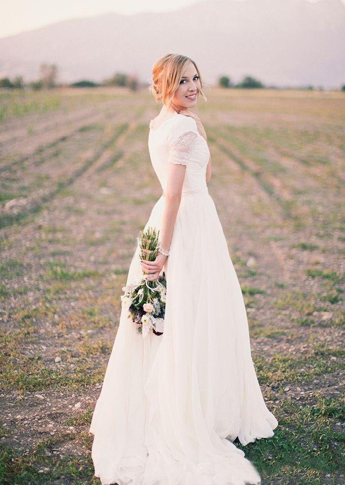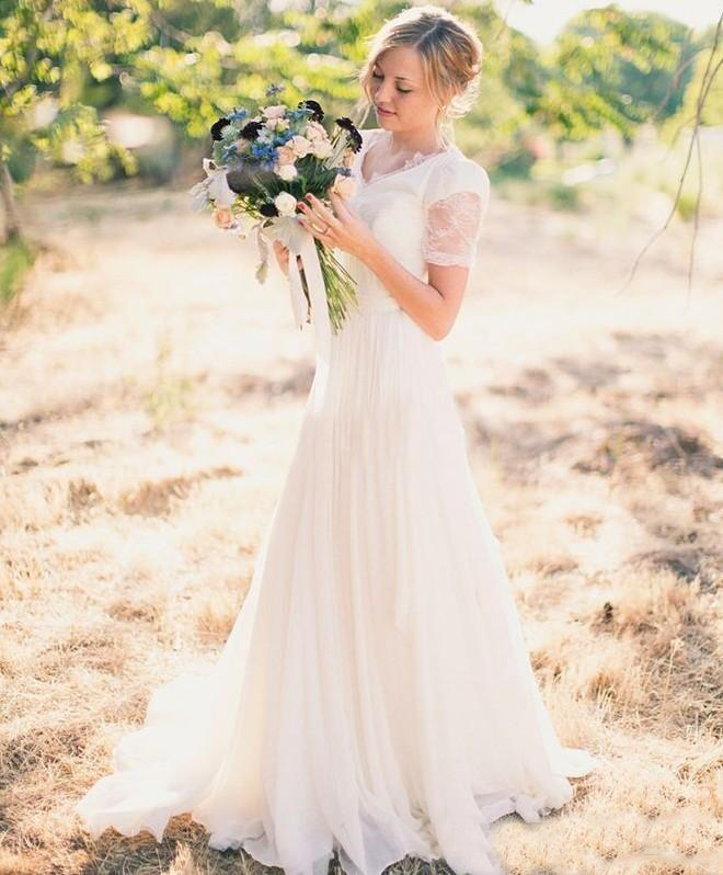 Modest Wedding Dresses A-Line Chiffon with Short Sleeves V Neck Sweep Length Sash Cheap Simple Spring Garden Wedding Party Bridal Gowns