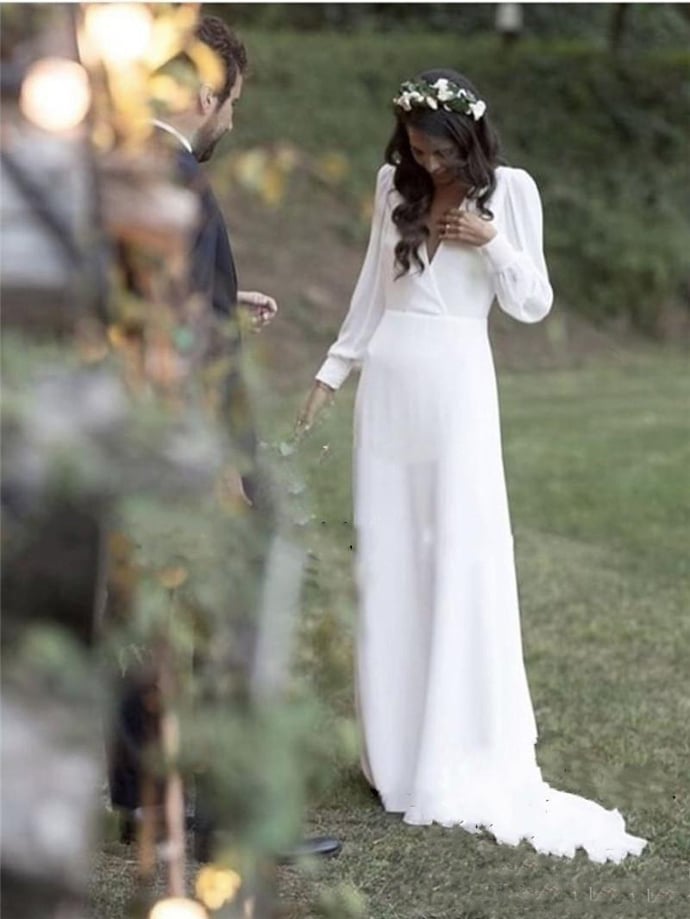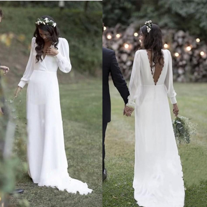 Bohemian White Wedding Dresses V Neck Backless Sweep Train Chiffon Beach Garden Country Bridal Gowns Plus Size