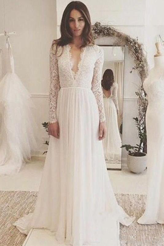 Hot Sale Lace Long Sleeves Deep V Neck Sexy Bridal Wedding Gowns Backless Sweep Train Chiffon A Line Wedding Dresses