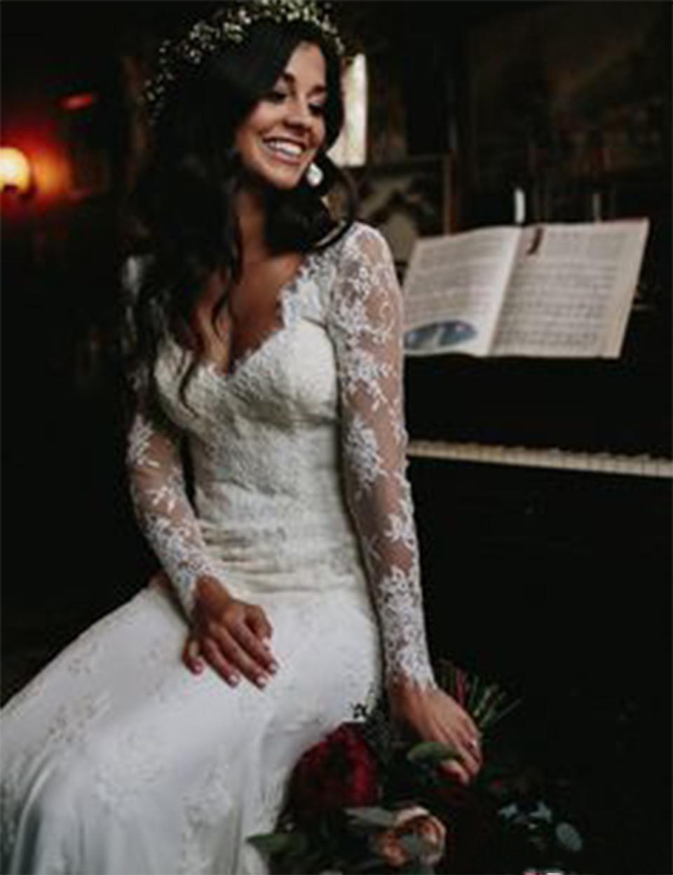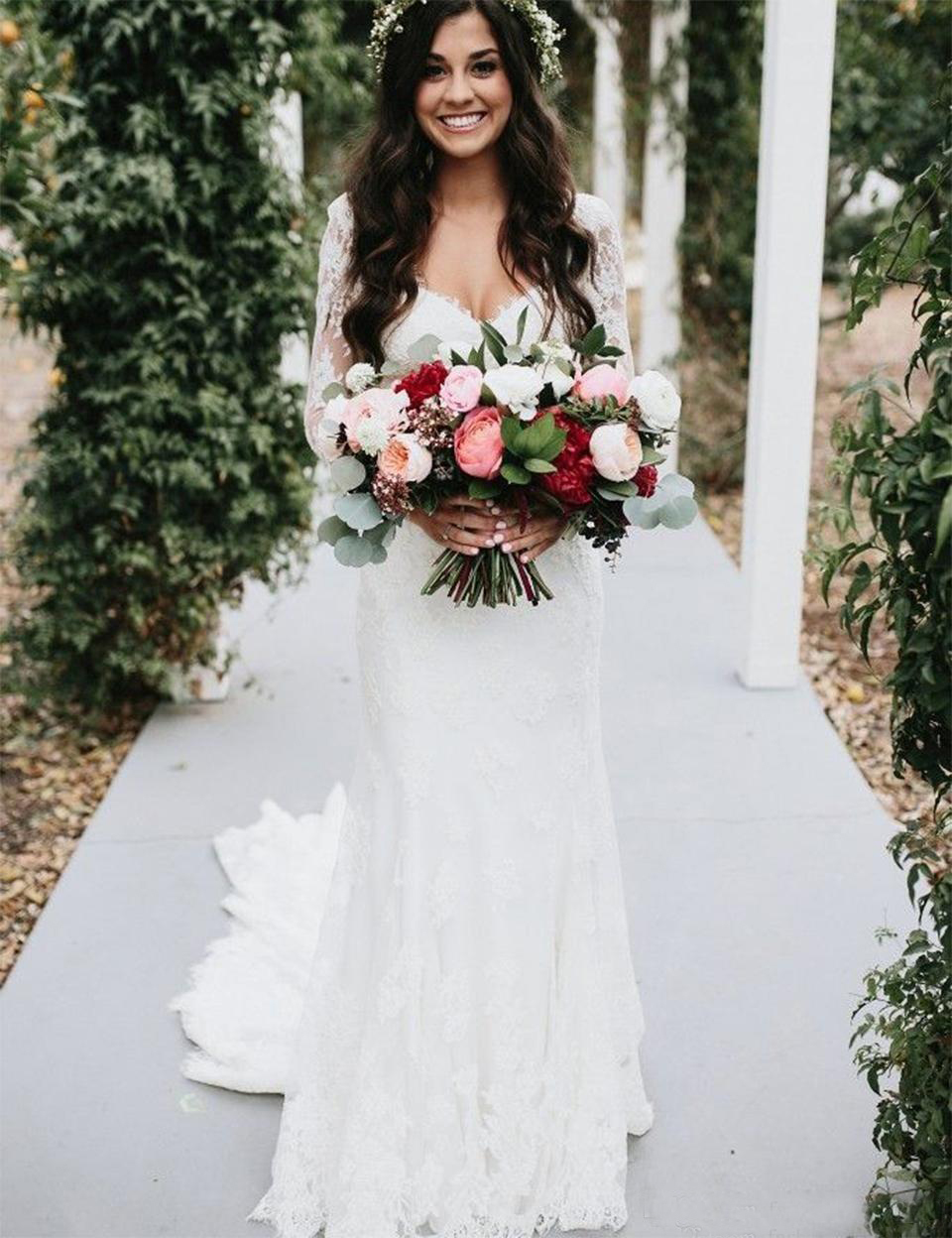 Bohemian Wedding Dresses Country Sweetheart Full Lace Appliques Beads Illusion Sheer Long Sleeves Backless Court Train Bridal Gowns