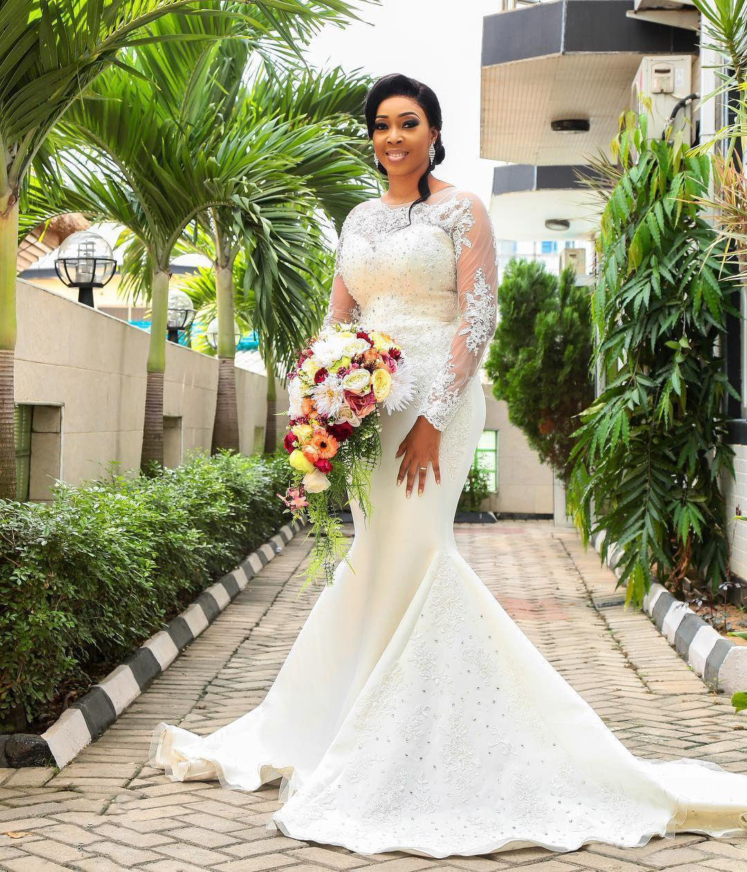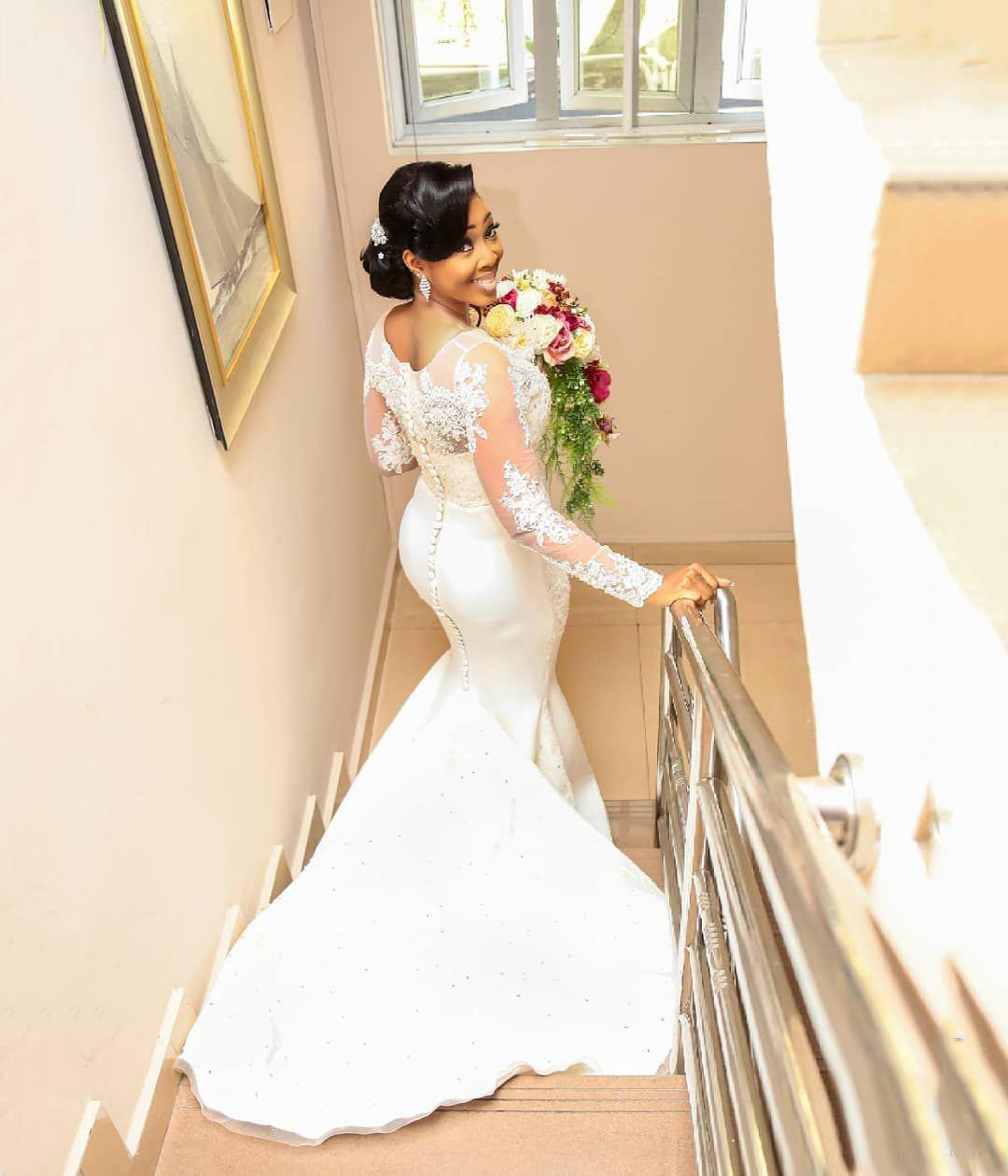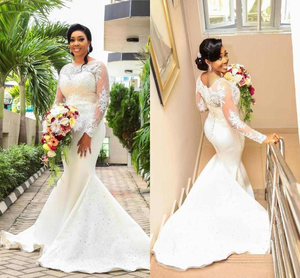 African Mermaid Wedding Dresses With Lace Appliques Beads Long Sleeves Bridal Gowns Count Train Back Covered Buttons Beach Wedding Dress