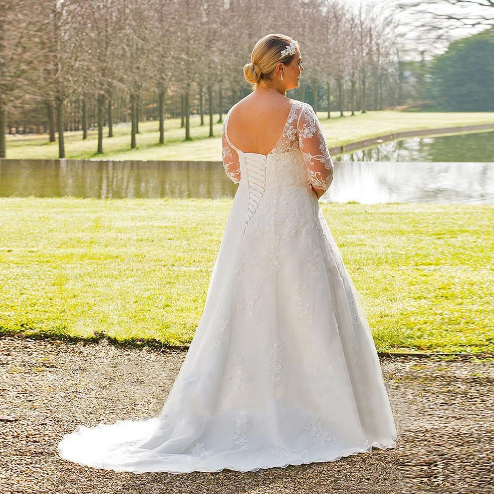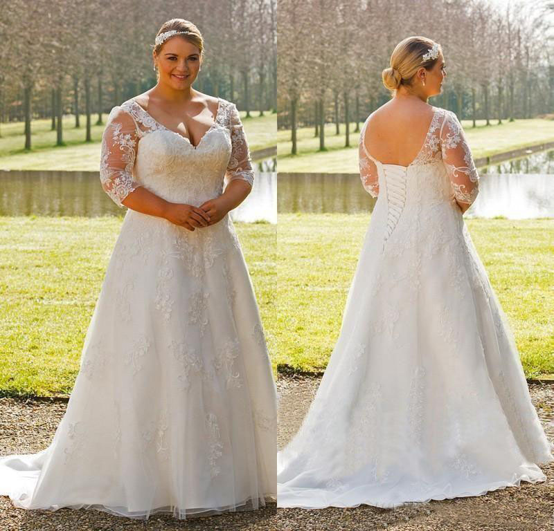 Vintage Lace Plus Size Wedding Dresses V-Neck 3/4 Long Sleeves Bridal Gowns A-Line Sexy Backless Sweep Train Custom Mad