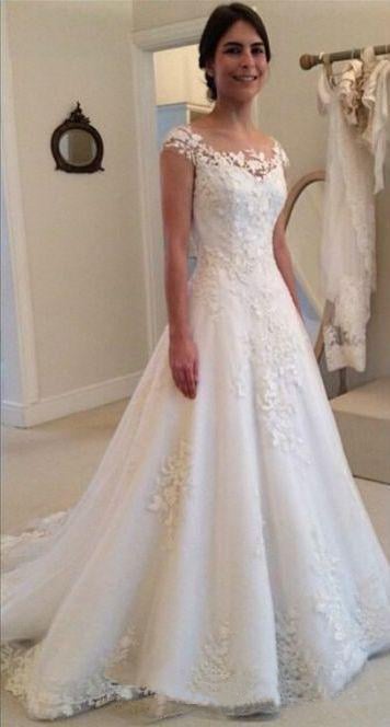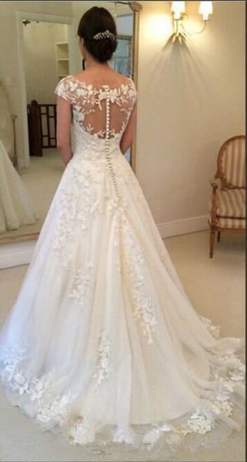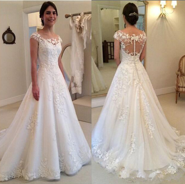 Modest New Lace Appliques Wedding Dresses A line Sheer Bateau Neckline See Through Button Back Bridal Gown Cap Sleeves