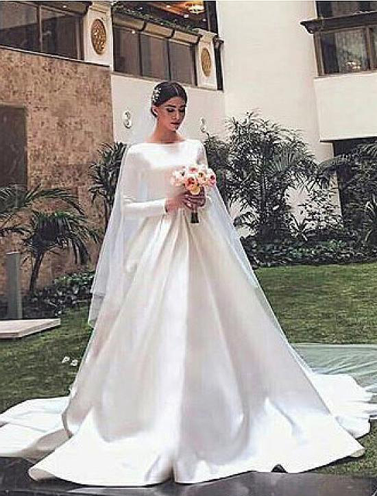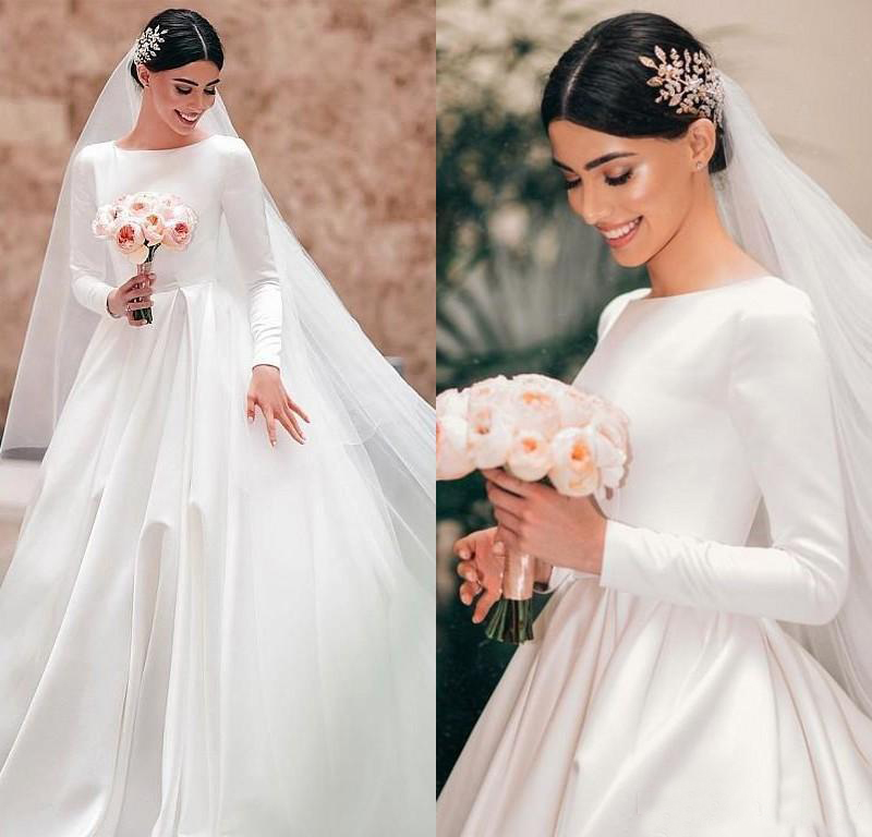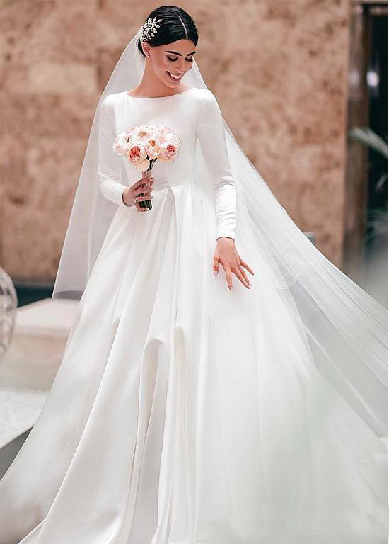 Modest Satin Bateau Neck Long Sleeves Wedding Dresses Sweep Train Plus Size Country Bridal Gowns