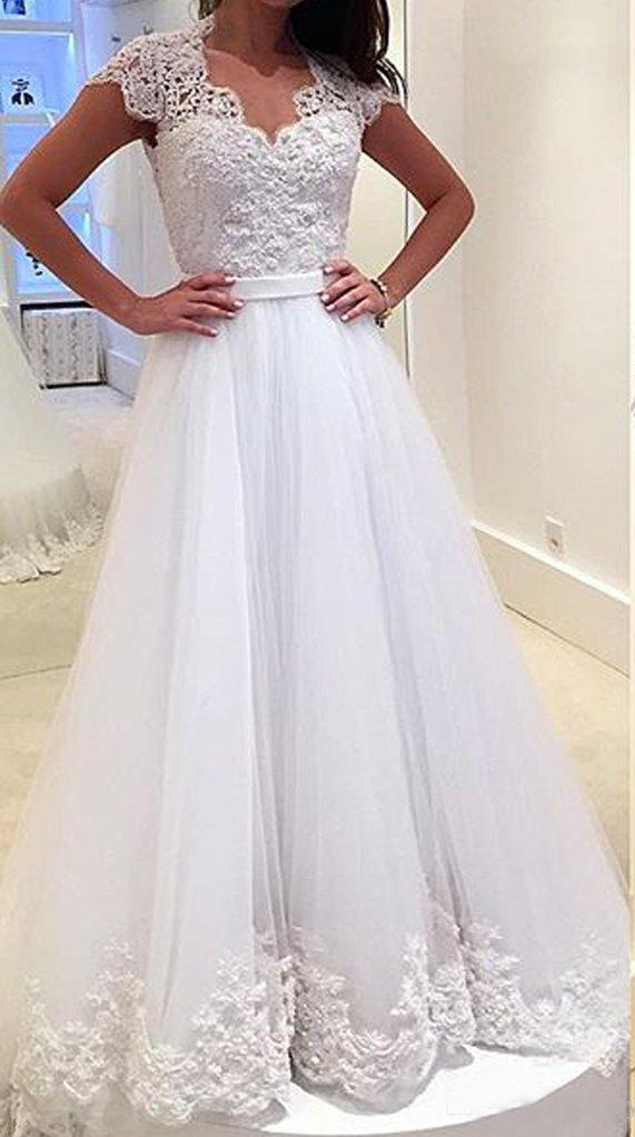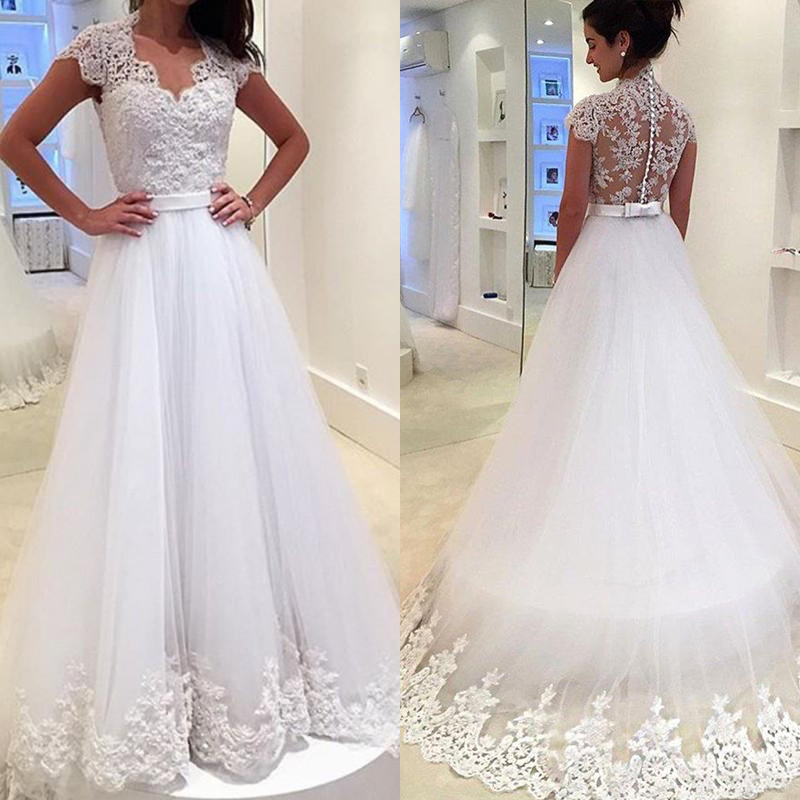 Holy Pure White A Line Wedding Dresses Sheer Cap Sleeves Appliques Sequined Button Covered Back Long Bridal Gowns Maternity Plus Size
