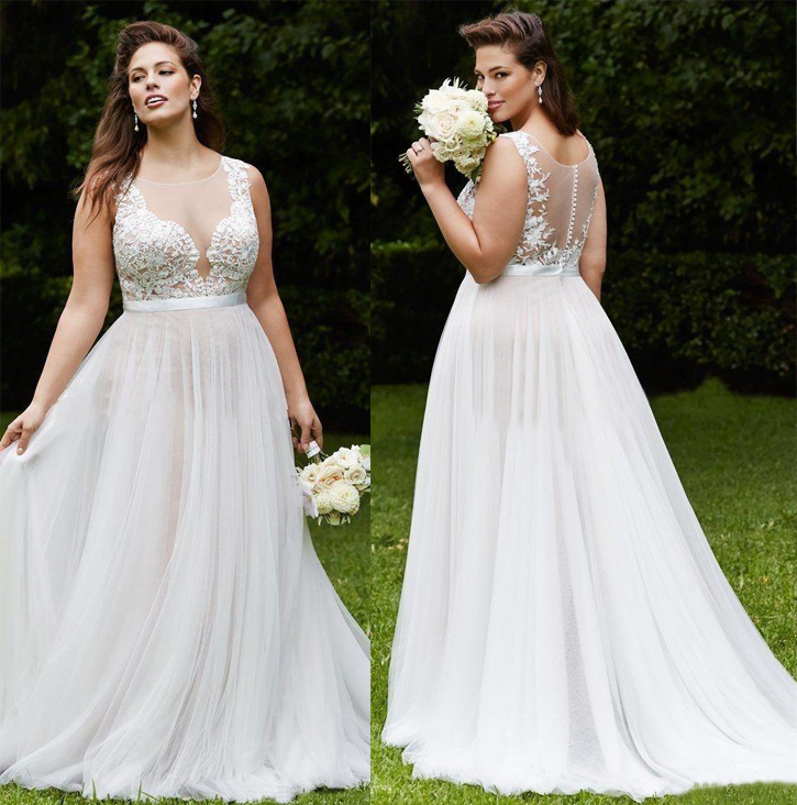 Vintage Country Lace Plus Size Wedding Dresses Sheer V Neck A Line Tulle Wedding Bridal Gown Custom Made Sweep Train
